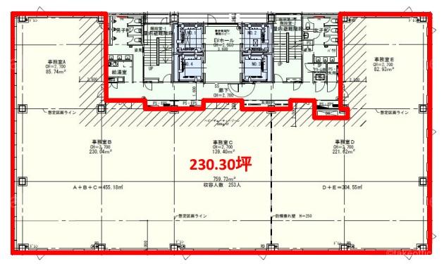 | 天井高 | 2700mm | 基準階面積 | 230.3坪(761.33m2) |