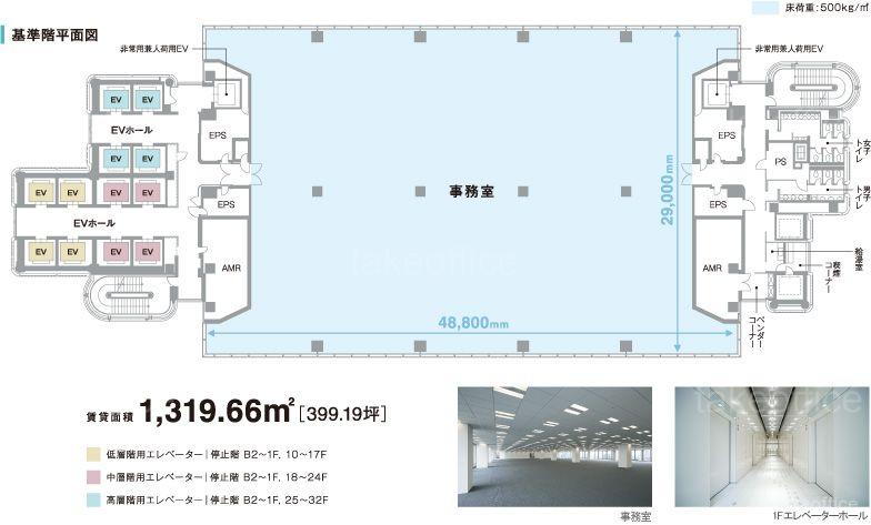 | 天井高 | 2800mm | 基準階面積 | 399.19坪(1319.64m2) |