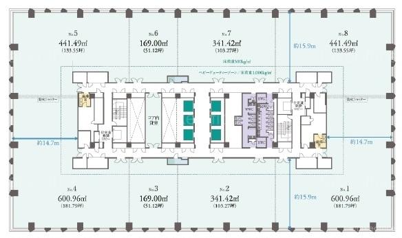 | 天井高 | 2800mm | 基準階面積 | 1109.45坪(3667.6m2) |